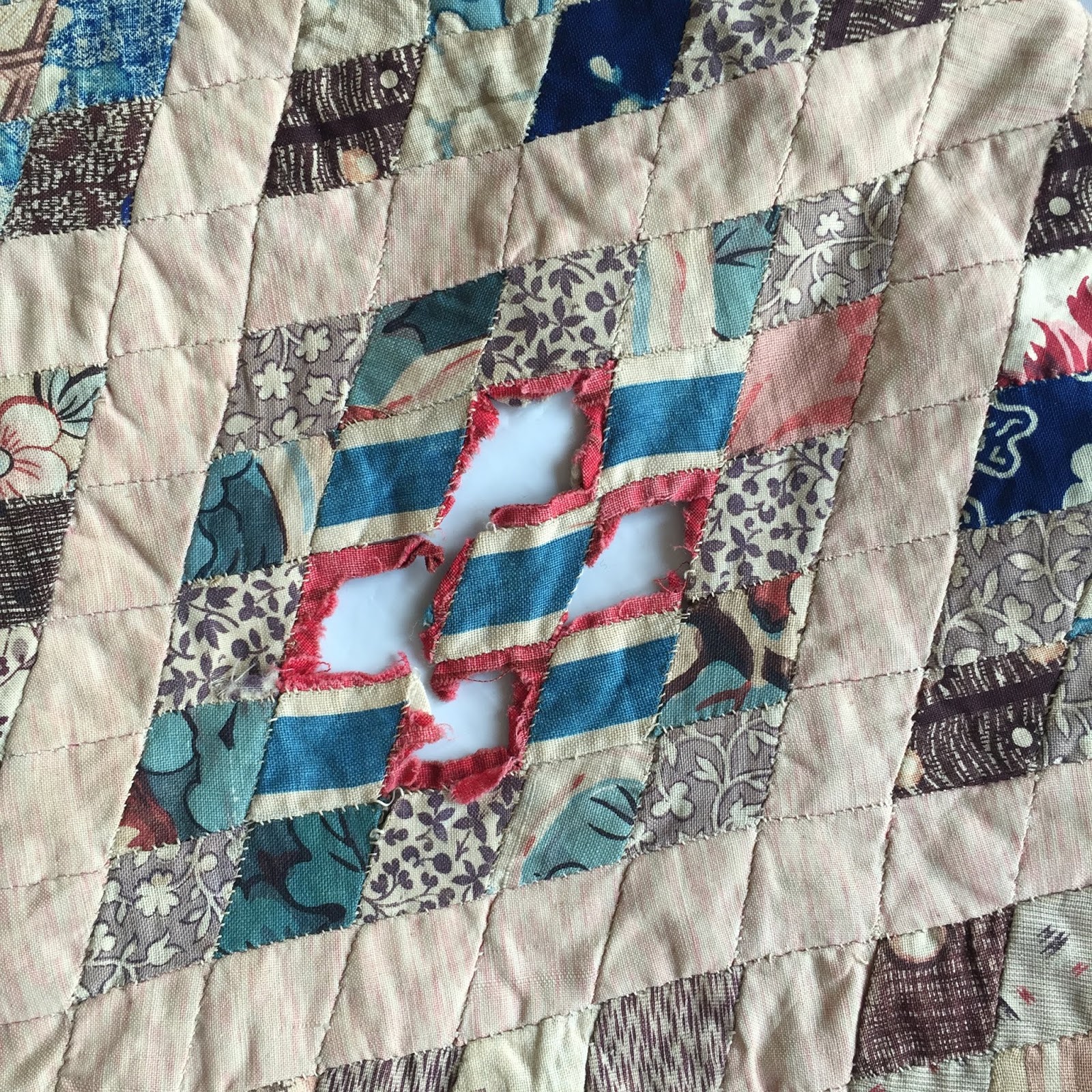 The task was pretty daunting. I needed to fill in the gaps, sew down the tatters, put in new batting, a new back, and quilt! I had a few ideas of my own too. But firstly I had to ensure that I did no further damage, the entire thing was so fragile, and large, that although all the work was going to be by hand I could not risk working on my knee.